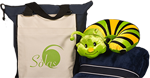 To make the bag usable for all patients, plush footies with grippers are included in the women’s bag. The children’s bag contains a friendly caterpillar neck pillow in lieu of the travel pillow (not recommended for children under the age of three), and the men’s bag contains a 100% washed cotton navy pigment-dyed baseball cap.